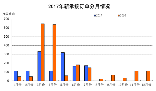 1~7月份,全國造船完工2978萬載重噸,同比增長55.1%。承接新船訂單1324萬載重噸,同比下降25.1%。7月底,手持船舶訂單8028萬載重噸,同比下降31.5%,比2016年底下降19.4%。