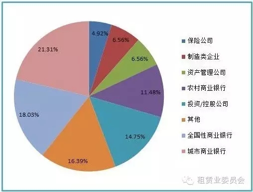 在所有金融租賃公司的控股股東和主要(前兩大)股東中,城市商業銀行占21.31%、全國性商業銀行占18.03%、農村商業銀行占11.48%、投資/控股公司占14.75%。需要說明的是,該比例是按照股東的數量計算,并非按照投資金額的權重計算,參考意義不大。