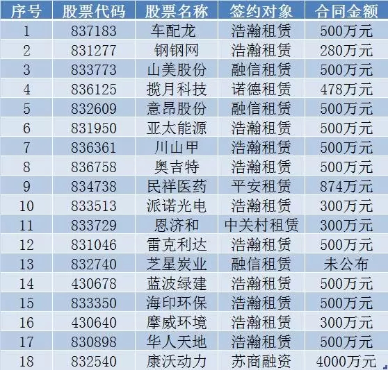 而從上文這些進行融資租賃交易的企業簽約對象看,新三板公司融信租賃(831379)無疑是最大收益者。