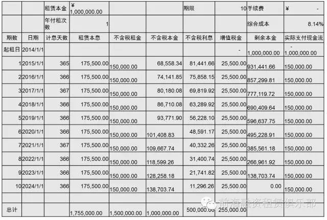 假設某融資租賃企業(適用增值稅稅率17%)購入資產的價值成本為1000000元,融資租賃合同總額1500000元(不含稅),分10年等額償還。不考慮未擔保余值,租賃期滿后融資資產的所有權轉移給承租方。租賃期間以第一年為例,計算出實際利率為8.14%(插值法計算),第一年末確認的融資收益為81400元,融資租賃的會計確認與計量如下: