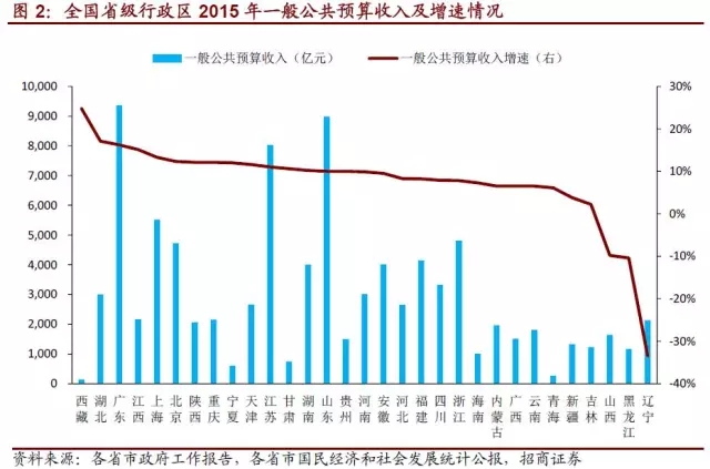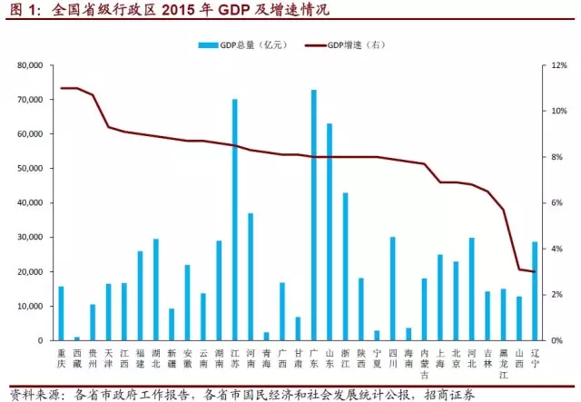 在諸多的統計指標中,我們選取地區生產總值(GDP)和一般預算收入兩個指標,數據來源包括但不限于各省、市《政府工作報告》、《國民經濟和社會發展統計公報》、《關于2015年預算執行情況和2016年預算草案的報告》、《經濟運行快報》,以及財政、統計等政府部門公開發布的信息。GDP增速一般根據官方公布的實際增長率進行統計,部分地區未公布的根據2015年和2014年的GDP數據計算名義增長率并在文中注明。有部分地區未能獲得一般預算收入數據的用財政收入代替,亦在文中做了注明。