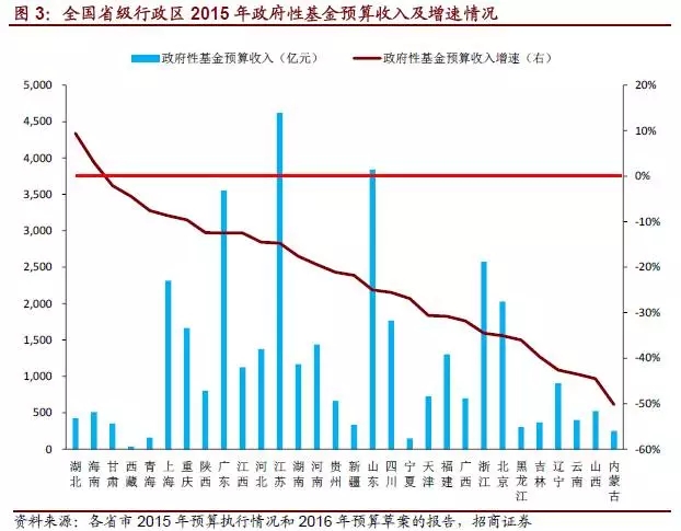 政府性基金預算收入增速方面,排前五的為湖北、海南、甘肅、西藏、青海,從整體上看,2015年各省市的政府性基金預算收入除了湖北(9.42%)、海南(3.06%)外均出現了不同程度的負增長,其中,黑龍江(-36.00%)、吉林(-39.70%)、遼寧(-42.60%)、云南(-43.50%)、山西(-44.50%)、內蒙古(-50.20%)的政府性基金預算收入在2015年下降幅度超過35%。