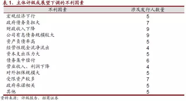 根據對2015年評級公司下調發行人評級的不利因素進行歸納梳理[1],導致主體評級或展望下調的原因可分成兩大類,一類是宏觀因素,主要包括地方宏觀經濟下行、政府債務負擔大、財政收入下降等,另一類是發行人微觀因素,主要包括公司有息債務規模較大、資產負債率高、經營性凈現金流凈流出、資本支出壓力大、營業收入、利潤下降、對外擔保規模大、受限資產較多等因素。從2015年主體評級或展望被下調的16家發行人看,地方財政收入下降、公司有息債務規模較大、受限資產多、政府債務負擔大是最主要的幾個原因。