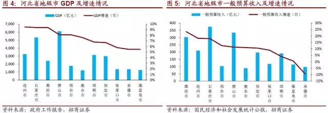 河北省2015年GDP總量超過3000億的地級市有唐山市、石家莊市、滄州市和邯鄲市,GDP總量低于2000億的有邢臺市、張家口市、承德市、秦皇島市、衡水市。2015年河北省GDP增速最高的為滄州市(9.5%),而張家口市(5.8%)、承德市(5.5%)、秦皇島市(5.5%)的GDP增速低于6%。
