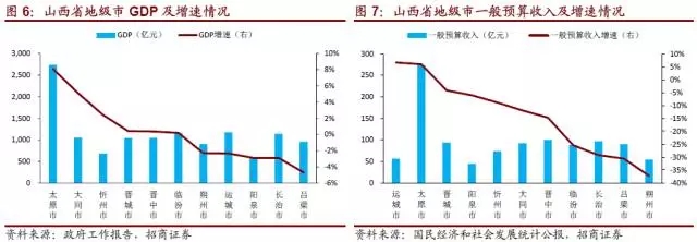 2015年,山西省地級市中只有太原市的GDP總量超過2000億,呂梁市、朔州市、忻州市、陽泉市四市的GDP均低于千億。GDP增速排前三位的為太原市(8.1%)、大同市(5.1%)、忻州市(2.4%),而有5個地級市出現了GDP負增長,分別是朔州市(-2.3%)、運城市(-2.3%)、陽泉市(-2.9%)、長治市(-2.9%)、呂梁市(-4.7%)。