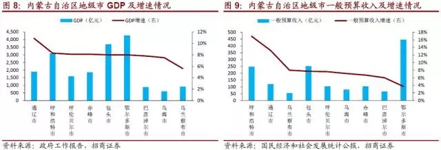 2015年一般預算收入,內蒙古自治區有鄂爾多斯市(445.9億)、包頭市(252.0億)、呼和浩特市(247.4億)在200億以上,烏海市(80.5億)、巴彥淖爾市(65.8億)、烏蘭察布市(55.1億)一般預算收入不足百億。呼和浩特市、通遼市一般預算收入增速超過10%,增速最低的為鄂爾多斯市(3.7%)。
