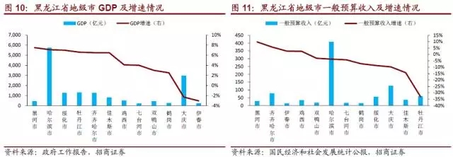 2015年一般預算收入,黑龍江省僅有哈爾濱市(407.7億)、大慶市(127.2億)超過百億,全省有四個地級市一般預算收入在20億以下,分別為雙鴨山市(18億)、七臺河市(17.2億)、鶴崗市(15.6億)、伊春市(14.2億)。2015年黑龍江省共有8個地級市的一般預算收入出現了下降,分為是雙鴨山市(-3.0%)、哈爾濱市(-3.7%)、七臺河市(-4.2%)、鶴崗市(-7.3%)、綏化市(-8.7%)、大慶市(-9.8%)、佳木斯市(-14.3%)、牡丹江市(-33.1%)。