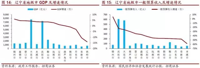 遼寧省2015年GDP總量排前三的地級市為大連市(7,700億)、沈陽市(7,280億)、鞍山市(2,326億),后五位均在1000億一下,分為是丹東市、朝陽市、鐵嶺市、葫蘆島市、阜新市,其中阜新市2015年GDP為530億。GDP增速方面,除了錦州市(6%)外,其余地級市增速均在5%以下,其中朝陽市(-1.0%)、丹東市(-3.1%)、阜新市(-10.6%)、鐵嶺市[1](-14.1%)GDP出現了負增長。