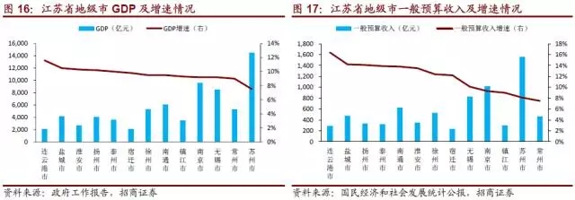 江蘇省2015年GDP總量排前三的地級市為蘇州市(14500億)、南京市(9600億)、無錫市(8500億),后三位為淮安市(2700億)、宿遷市(2110億)、連云港市(2100億)。GDP增速方面,江蘇省的13個地級市均在7.5%以上,蘇州市2015年GDP增速為7.5%,在江蘇省居于末位。