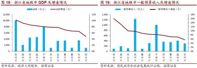 2015年杭州市、寧波市的一般預算收入在千億以上,排后最后兩位的麗水市(94.6億)、衢州市(92億)一般預算收入不足百億。一般預算增速排前三的為麗水市(16.0%)、湖州市(13.2%)、舟山市(10.0%),排后三位的為嘉興市(7.1%)、溫州市(7.0%)、臺州市(5.6%)。