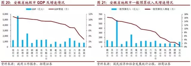 一般預算收入總量排前三的地級市為合肥市(571.5億)、蕪湖市(263.5億)、滁州市(143.7億),有6個地級市一般預算收入低于100億,分別為亳州市、淮南市、池州市、黃山市、銅陵市、淮北市。一般預算收入增速排前三位的地級市為滁州市(16.3%)、阜陽市(16.0%)、合肥市(14.2%),增速排后三位的為淮南市(2.6%)、銅陵市(2.5%)、安慶市(0.9%)。