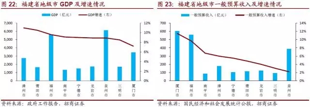 福建省2015年GDP總量排前三的地級市為泉州市、福州市、廈門市,后三位為莆田市(1,655.2億)、寧德市(1500億)、南平市(1,339.5億)。全省有2個地級市GDP增速超過10%,分別漳州市(11.0%)、莆田市(10.5%),GDP增速后三位為泉州市(8.9%)、三明市(8.5%)、廈門市(7.2%)。