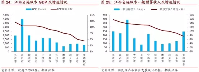 一般預算收入總量[1]排前三的地級市為南昌市(389.2億)、九江市(247.2億)、贛州市(245.5億),有3個地級市一般預算收入低于100億,分別為新余市、景德鎮市、鷹潭市。一般預算收入增速排前三位的地級市為九江市(15.7%)、上饒市(14.5%)、南昌市(13.7%),增速排后三位的為新余市(9.9%)、撫州市(9.0%)、贛州市(7.5%)。