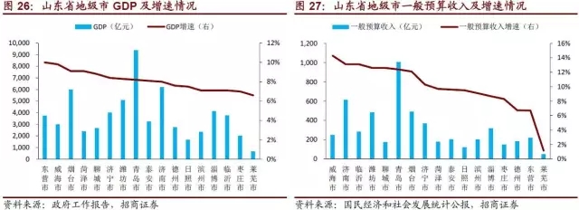 山東省2015年GDP總量排前三的地級市為青島市(9400億)、濟南市(6200億)、煙臺市(6002億),后三位為棗莊市(2030億)、日照市(1670億)、萊蕪市(665.8億)。GDP增速方面,東營市GDP增速達到了10%,增速后三位為臨沂市(7.1%)、棗莊市(7.0%)、萊蕪市(6.6%)。