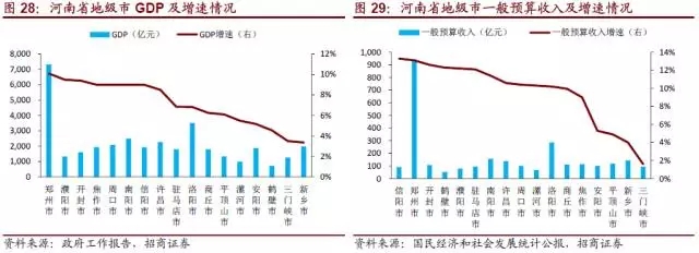 一般預算收入方面,排第一的鄭州市2015年的一般預算收入達到942.9億,其余地級市均在300億以下,排后三位的為濮陽市(79.0億)、漯河市(68.3億)、鶴壁市(52.9億)。一般預算收入增速排前三位的地級市為信陽市(13.3%)、鄭州市(13.1%)、開封市(12.6%),增速排后三位的為平頂山市(4.9%)、新鄉市(4.0%)、三門峽市(1.6%)。