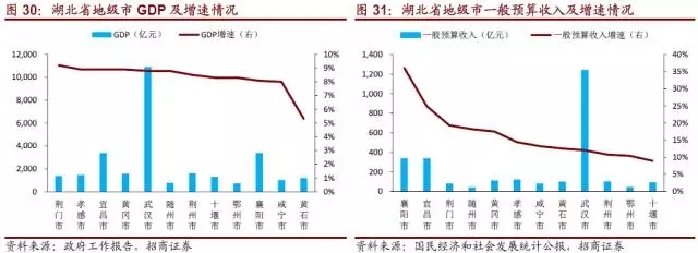 湖北省2015年GDP總量排前三的分別為武漢市、宜昌市和襄陽市,其中武漢市(10,905.6億)GDP總量超過萬億,GDP總量排后三位的為咸寧市(1030.1億)、隨州市(785億)、鄂州市(730億)。GDP增速方面,除黃石市(5.3%)外其余地級市GDP增速都在8%以上。