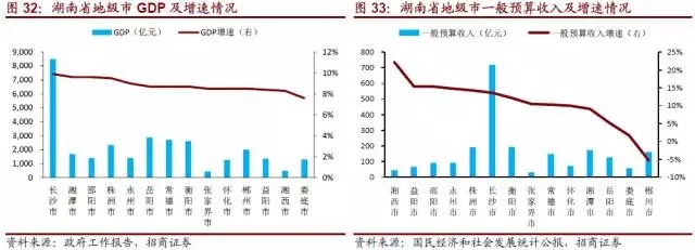 一般預算收入總量[1]排前三的地級市為長沙市(719億)、衡陽市(194.6億)、株洲市(191.4億),有2個地級市一般預算收入低于50億,分別為湘西市(46.1億)、張家界市(31.6億)。一般預算收入增速排前三位的地級市為湘西市(22.2%)、益陽市(15.4%)、邵陽市(15.4%),增速排后三位的為岳陽市(5.2%)、婁底市(1.7%)、郴州市(-5.3%),郴州市是全省唯一一般預算收入出現負增長的地級市。