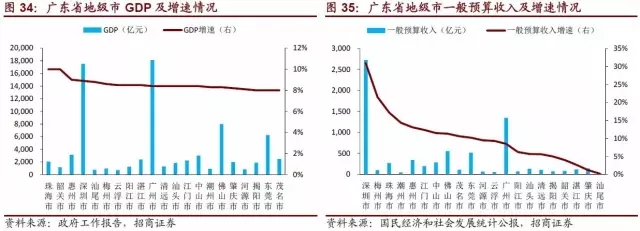 一般預算收入總量有兩個地級市突破千億,分別為深圳市(2,727.1億)、廣州市(1,349.1億),全省有2個地級市一般預算收入低于50億,分別為潮州市(47.2億)、汕尾市(28.8億)。一般預算收入增速排前三位的地級市為深圳市(30.9%)、梅州市(21.5%)、珠海市(17.2%),全省一般預算收入增幅后三位的為湛江市(2.7%)、肇慶市(1.2%)、汕尾市(0.21%),其中汕尾市一般預算收入同比下降41.43%,在剔除以前年度虛增收入退庫調整因素后實現0.21%的微幅增長。