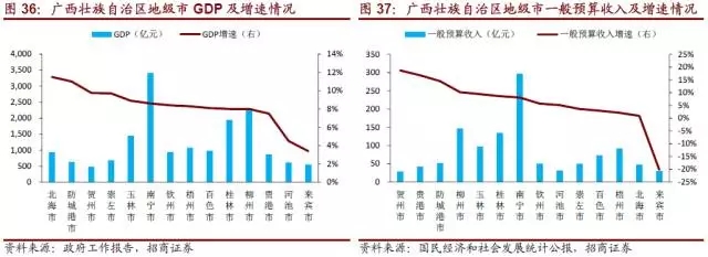 一般預算收入總量排前三的地級市為南寧市(297.1億)、柳州市(146.7億)、桂林市(134.5億),后三位分別為河池市(31.5億)、來賓市(30.3億)、賀州市(29億)。一般預算收入增速排前三位的地級市為賀州市(18.7%)、貴港市(16.8%)、防城港市(14.5%),增速排后三位的是梧州市(2.1%)、北海市(0.9%)、來賓市(-20.2%),其中,來賓市的一般預算收入出現了較大幅度的下降。