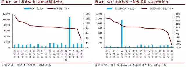 四川省2015年GDP總量排前三的為成都市(10,800億)、綿陽市(1,700.3億)、德陽市(1,605.1億),后三位為廣元市(605.4億)、雅安市(502.6億)、巴中市(500億),全省有四個地級市GDP增速超過或達到10%,分別為遂寧市(13.2%)、瀘州市(11%)、廣安市(10.6%)和眉山市(10%),僅有達州市(3.1%)GDP增速低于7.5%。