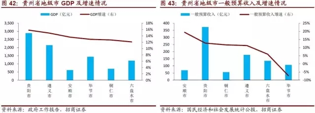 貴州省2015年GDP總量超過2000億的地級市有兩個,分別為貴陽市(2,891億)和遵義市(2,153億),有兩個地級市總量小于1000億,為銅仁市(700億)和安順市(620.4億)。貴州省所有地級市GDP增速均超過12%。