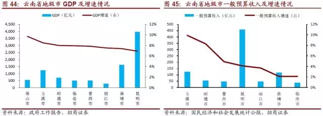 云南省有三個地級市2015年GDP總量超過1000億,分別為昆明市(3970億)、曲靖市(1630.3億)和玉溪市(1245.7億),后三位為普洱市(514.4億)、臨滄市(502.1億)、麗江市(290億)。全省GDP增速第一為保山市(9.7%),而曲靖市(7.4%)和昆明市(6.9%)GDP增速低于7.5%。