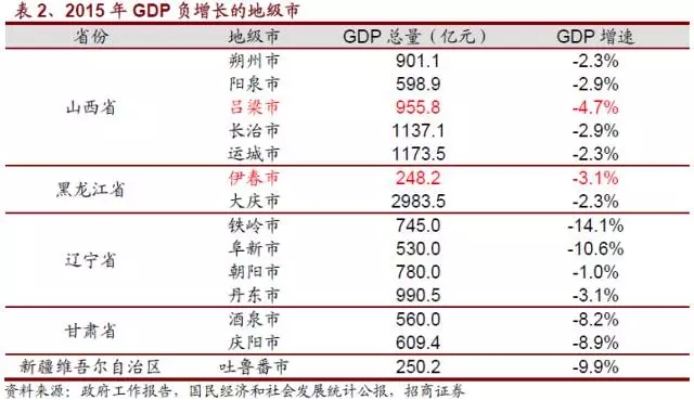 地區GDP是衡量一個區域整體經濟發展水平的指標,GDP增速的下滑甚至負增長,會影響該地區的經濟發展和社會穩定。根據2015年的數據,從省級行政區層面看,吉林省(6.5%)、黑龍江(5.7%)、山西(3.1%)、遼寧(3%)的地區GDP增速較低,從地級市層面看,有14個地級市[1]的GDP出現了負增長,其中呂梁市和伊春市的GDP已經連續兩年下降。