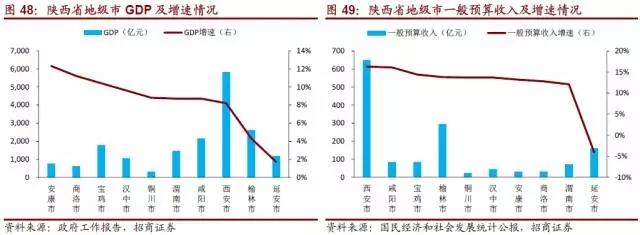 陜西省2015年GDP總量超過2000億的地級市有西安市、榆林市和咸陽市,GDP總量低于1000億的有安康市、商洛市、銅川市。2015年安康市(12.3%),商洛市(11.2%)、寶雞市(10.4%)GDP增速超過10%,GDP增速排后三位的為西安市(8.2%)、榆林市(4.3%)、延安市(1.7%)。