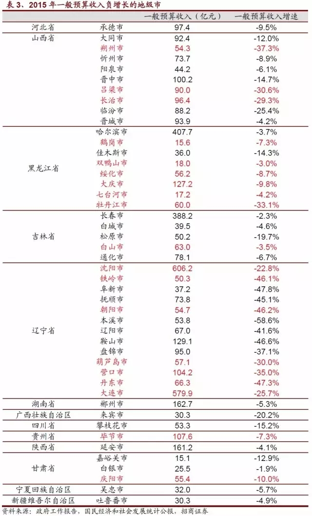 一般預算收入是地方財政收入中變化相對穩定的指標,稅收收入是其中最重要的組成部分,因此一般預算收入的變動能夠直接反映經濟的運行質量,在城投債的評級框架下,一般預算收入也是衡量地方財力,以及地方政府對城投公司和城投債潛在支持能力的重要指標。從省級行政區層面看,2015年新疆維吾爾自治區(3.8%)、吉林省(2.2%)、山西省(-9.80%)、黑龍江省(-10.4%)、遼寧省(-33.4%)的一般預算收入增速都有下滑,其中山西省、黑龍江省、遼寧省出現了較大幅度的負增長。從地級市層面看,有46個地級市的一般預算收入出現了負增長,尤其是山西省、黑龍江省、吉林省、遼寧省的地級市出現了大面積的負增長。其中有19個地級市(表3中用紅色標出)連續兩年一般預算收入負增長,雙鴨山市、七臺河市、白山市、鐵嶺市已經連續三年負增長。