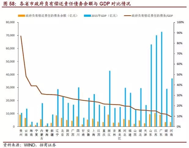 在國際上政府債務余額占GDP的比率是常用的衡量政府負債程度的指標之一,該比率越高,政府的負債壓力就越大。我們根據各省市公布的政府負有償還責任的債務余額[1]和2015年各地GDP進行比較,比率排前五位的為貴州(86.98%)、云南(48.32%)、海南(39.13%)、寧夏(39.11%)、內蒙古(31.47%),比值排后五位山東(15.13%)、江蘇(15.06%)、廣東(12.55%)、湖南(11.97%)、河南(9.53%)。
