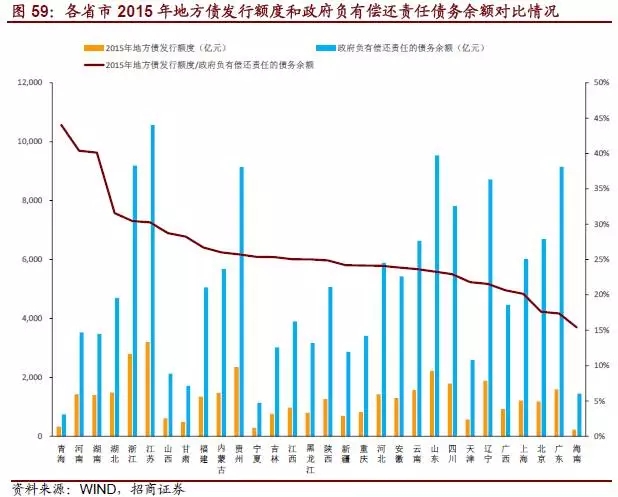 另外,我們統計了2015年用以置換存量地方政府債務的地方債券發行規模,并與政府負有償還責任的債務余額進行比較,得出各省市已發行地方債對存量債務的覆蓋比率,比率排前五位的是青海(44.04%)、河南(40.38%)、湖南(40.11%)、湖北(31.57%)、浙江(30.44%),表明已發行地方債對債務存量的置換覆蓋較高,而比率排后三位的是廣西(20.65%)、上海(20.14%)、北京(17.61%)、廣東(17.37%)、海南(15.39%),其中上海、北京、廣東經濟發展水平較高,相應的融資償債能力也較強,廣西和海南的后續債務融資壓力相對較大。