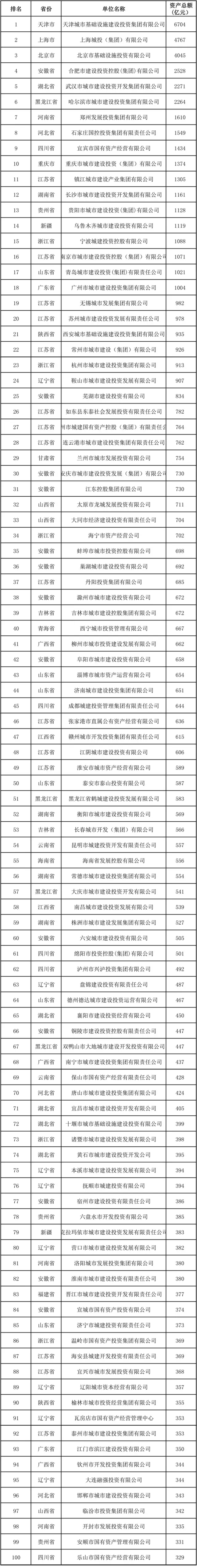 3、十強排名變化莫測。此次排名中,天津城市基礎設施建設投資集團有限公司以6704億元的資產總額仍然高居榜首。第二名是上海城投(集團)有限公司,第三名是北京市基礎設施投資有限公司,前三名依舊延續上一年的排名,這三家公司的總資產規模為15516億元,占到本次統計的全國城投企業總資產的13.72%。合肥市建設投資控股(集團)有限公司以2528億首次沖入前四,成為省會城市中資產規模最大的城投公司。宜賓市國有資產經營有限公司成為此次排名的最大亮點,也是唯一一家進入十強的地級市城投公司,位于重慶市城市建設投資(集團)有限公司之前,以1434億位居第9位。前十強中四個直轄市城投公司均榜上有名,省會城投占據了5席。