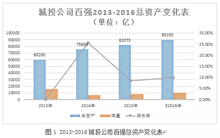 1、資產規模持續增長。2015年,中國城投公司百強總資產規模達到了8.2萬億元。對照2014年,百強城投公司總資產規模增加6464億元,對比2013年增加2.18萬億。年均資產規模增長率達14%。預計到2017年,我國城投公司百強總資產規模將突破10萬億元。