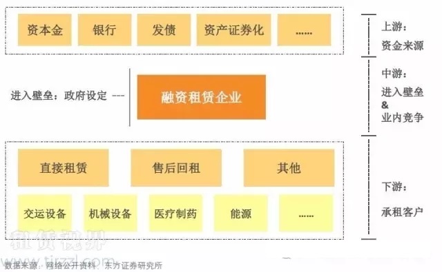 融資租賃企業的資本中介特性決定了其產業鏈上下游是以資金流動決定的。其中,上游是資金來源,包括通過自有資金投入、銀行貸款、發行債券、資產證券化等渠道所帶來的資金,下游是資金通過直接租賃、售后回租等模式投向交運、機械、醫療、能源等不同的行業,從中賺取利差。