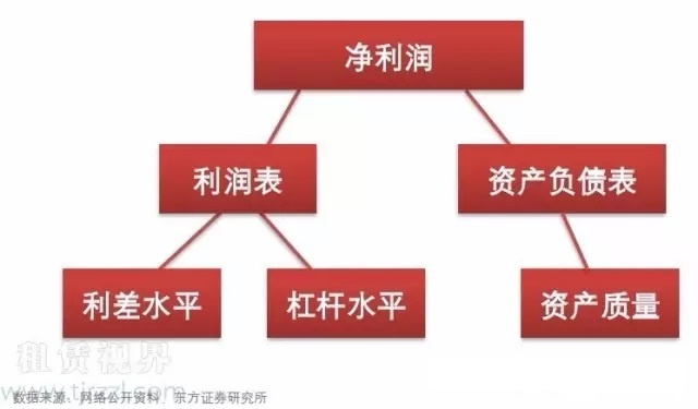 從財務報表的角度對融資租賃公司進行業務分析,有三個研究重點:利差水平、杠桿大小和資產質量。其中,利差由利息收入和利息支出決定,用利差收入除以生息資產來衡量,結合資產負債表可以簡單理解為ROA;杠桿使得公司得以通過高杠桿融資,成倍擴大業務規模,結合股債融資成本的影響,即可推算ROE;除此之外,資產質量影響潛在的資產減值損失,最終傳導至凈利潤。