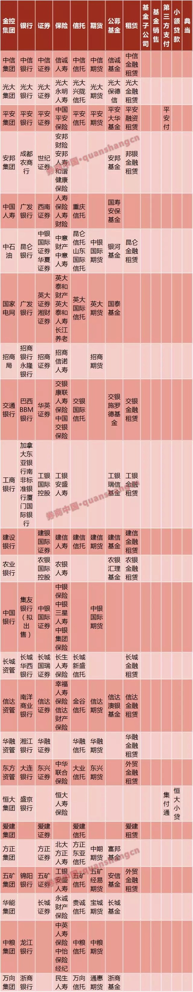 繼中信、光大、平安金控集團后,目前我國已經形成了數十家大型金融控股集團,當中包括央企產業資本的招商局、中石油和國家電網等;銀行系的工農中建交;四大資產管理公司華融、信達、東方、長城。這些央企控股的大型金控集團通常資產龐大,掌握著核心產業和資源,金融牌照已基本囊括齊全。