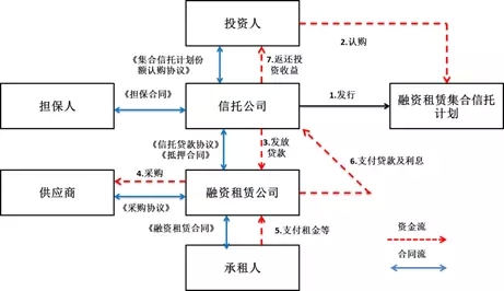 信托公司通過發行融資租賃集合資金信托募集資金,然后把資金貸給租賃公司,租賃公司用該資金購買租賃物,并出租給承租人使用。融資租賃公司以出租該資產所產生的租金收益按期向信托公司償還貸款本息,實現投資者信托收益。