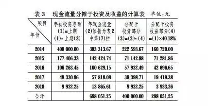 首先,出租人甲公司編制2014年12月31日至2018年12月31日借款的本金償還及利息分攤表,如表1所示。其次,出租人甲公司編制年現金流量計算表,見表2。從表2可以看出,應稅所得在租賃期的前兩年是負數,后三年是正數且逐漸增加,正是租賃期內計提的利息費用和折舊費用前期較高、后期較低所致。整個租期內,現金流量凈增加額為298 051.25元。再次,出租人甲公司將現金流量分攤于投資及收益,編制表3。根據表2中的年現金流量,通過計算可知該租賃投資內含報酬率為40.18%,采用租賃投資內含報酬率作為分配率,將年現金流量分配到年初投資凈額為正數的年份,得到分配于投資收益部分。