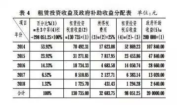 最后,以表3中所分配的各年收益占總收益的比重為分配率,將政府補助收益總額和租賃投資稅前收益總額分配至各年并予以確認,分配結果見表4。