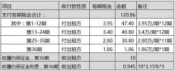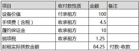 某公司資金缺口約80萬,擬與某租賃公司達成一售后回租協議:租賃標的物為某大型機器設備,租賃標的物市場價格100萬元,租賃期限36個月,承租方需負擔一定金額手續費、銷項稅款,租賃初始,承租方需繳納10萬元履約保證金,期滿后退回,履約保證金按3.15%計息,利息從第36期租金中抵扣。具體雙方收付款項目如下: