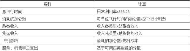 應該指出的是,在這種方法下的方程,擁有很多條目被乘以的時候,可以被抵消。之所以能夠被抵消,是因為收入和支出的數據被分解得太詳盡。這種分解允許將特定的、獨立的數據指標分開,因此我們能夠計算出總的飛機理論價值對于特定收入和成本部分的敏感性。模型中主要影響因素被定義如下:客運和貨運收入、直接成本支出(比如人力、燃料)、維修費用、折舊、和攤銷、總的運營成本以及其他與運輸有關的費用。還有一些數據必須計算在其中,這些數據或者不能直接獲得(消費燃油的總加侖數),或者不能通過機型來分解(比如服務、銷售和總費用),或者不能取決于其他數據的數據(比如總的飛行時間)。