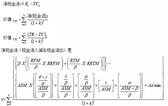 在這一部分,現金流折現模型應用于飛機價值評估,并且是基于不同的物理狀況和市場行情。接下來的幾個公式能運用于將未來的現金流折現,從而計算出投資的現值。未來的所有現金流入和現金流出之和就是凈現值。通過預測的未來現金流入和現金流出,這個計算方法可以分析飛機的價值。