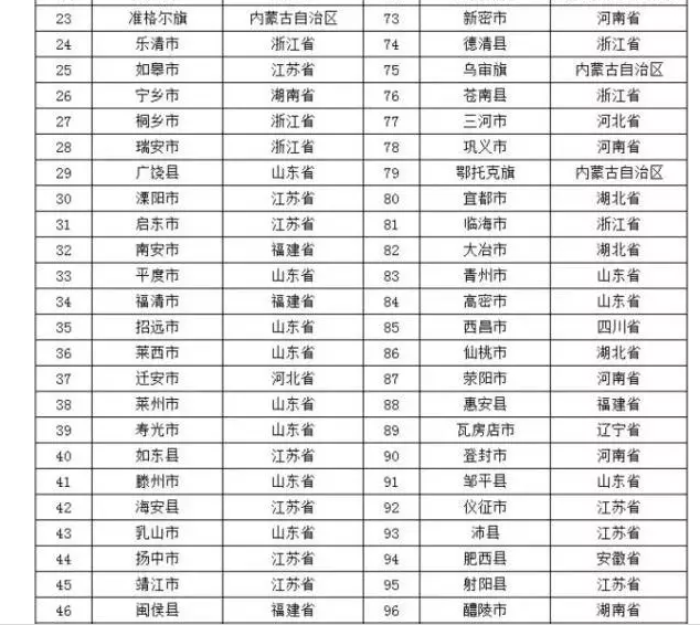 東部地區占據百強縣的76席,僅蘇浙魯就有66個,其中江蘇省蘇州市的4市、南通市的3市2縣,浙江省嘉興市的3市2縣、寧波市的2市2縣,山東省青島市的4市等全線上榜。而廣東、遼寧、安徽、江西、陜西、四川、云南、新疆等省區均僅有1縣入榜,黑龍江、吉林、山西、青海、甘肅、寧夏、廣西、貴州、西藏等省(自治區)的縣域則無緣百強榜。