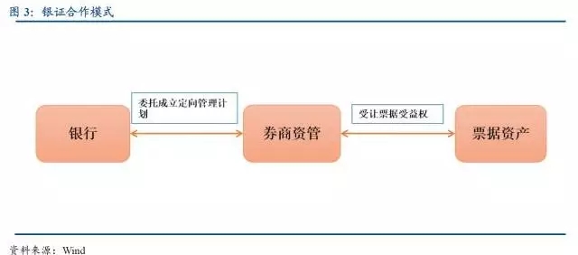 銀證合作模式:銀行與券商簽署協議設立定向資產管理計劃,銀行委托券商資產管理部門管理自有資金,券商將委托的自有資金購買銀行的貼現票據(表內),并委托托收銀行到期收回兌付資金。銀行持有的資管計劃受益權計入表外。實際交易環節還會加入一家甚至多家過橋銀行。銀行A將資金交給銀行B,再委托券商成立資管計劃購買銀行A的票據。