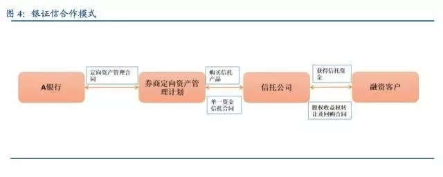 銀證信合作模式:由于銀信合作業務受凈資本約束或投資資產的限制,往往在銀行與信托之間通過一道券商設立的定向資管計劃,銀行理財購買資管計劃,再通過資管計劃認購信托產品。