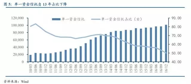 信托通道業務以單一資金信托為主。截止16年末,單一資金信托規模為10.21萬億元,我們估計信托通道規模要略小于這一數據。從2010年到2012年其規模迅速擴張,12年末規模是10年末的1.3倍;而其占比自2013年來逐步下降、增速也逐漸放緩。一方面監管加強對銀信合作業務的約束,另一方面券商資管與基金子公司相比約束較小,部分取代了信托通道的功能。