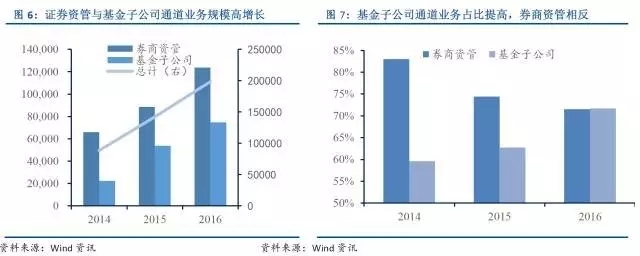 截止2016年末,券商資管與基金子公司中通道業務規模為19.84萬億元。其中券商資管占比較高,規模為12.4億元;資金子公司為7.5億元。通道業務的規模在過去兩年里加權增速達50%。基金子公司在過去受益于沒有凈資本約束,在費率上更有優勢,規模擴大更快。16年末通道業務占比為71.7%,與14年相比提高了12.1個百分點。券商資管的通道業務占比在過去兩年則逐步下降,與14年相比16年末通道業務占比降低了11.5個百分點。