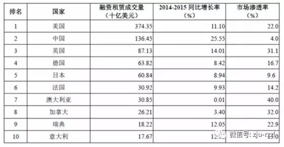 在歐美等發達國家,融資租賃已經成為銀行貸款之外的第二大企業融資渠道。以2015年當年融資租賃成交量計,全球前10大融資租賃國家情況如下: