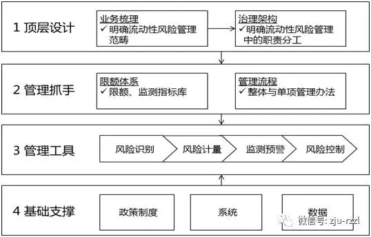 租賃公司流動性風險管理的“脆弱性”和“迫切性”,要求租賃公司必須上好流動性風險管理的“必修課”,結合行業實踐,本文擬從“頂層設計”、“管理抓手”、“管理工具”、“基礎支撐”四方面,提出租賃公司流動性風險管理“必修課”的整體思路,具體如圖1所示。