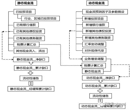 “資產負債管理”是基于租賃公司當前的“資產負債表”,那“現金流量管理”則是基于租賃公司未來的“現金流量表”。現金流量管理,關注的是租賃公司現金流缺口與融資能力的比較,現金流缺口測算是對未來現金流入流出及融資能力的綜合分析,可以分為三個步驟:第一步是基于合同的靜態現金流,包括租賃業務的本金和利息收入和銀行借款的還本付息;第二步是進行客戶行為模式的調整,比如貸款違約的情況;第三步考慮資產負債表的動態發展,即業務續作和業務新增對現金流的影響。